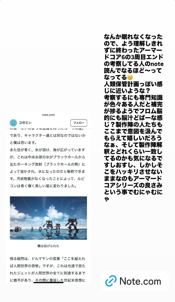 ジャムセッションを終えて、普段は基本的に全くお酒を飲まないものの、HAPPYなドラマーから振る舞われたテキーラを飲んで帰宅後に、世界出荷本数300万本を記録した名作「アーマードコア6」へ想いを馳せて眠れなくなってしまった時に、インスタのストーリーズに思いつくままに更新した内容を文章として残しておきます。