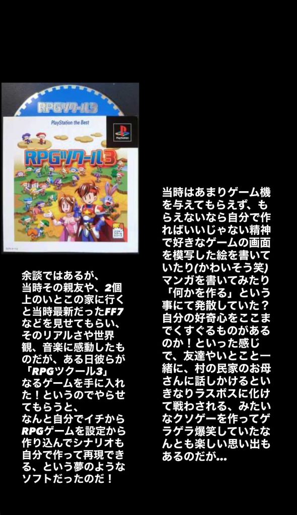 当時その親友や、2個上のいとこの家に行くと当時最新だったFF7などを見せてもらい、そのリアルさや世界観、音楽に感動したものだが、ある日彼らが「RPGツクール3」